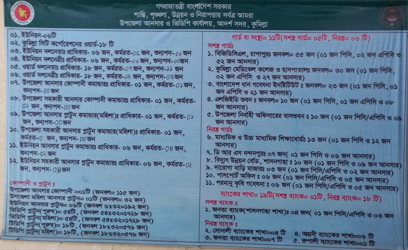 আইন শৃঙ্খলা রক্ষায় পুলিশ বাহিনীকে সহযোগিতা করা। যেমনঃ- জাতীয় ও স্থানীয় নির্বাচন, দূর্গাপুজায় যোগ্যতা সম্পন্ন আনসার ও ভি.ডি.পি বাছাই ও নিয়োগ প্রদান।